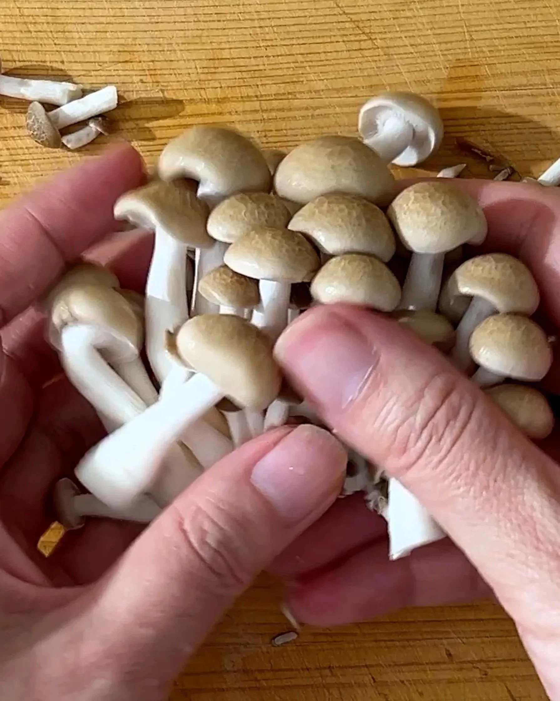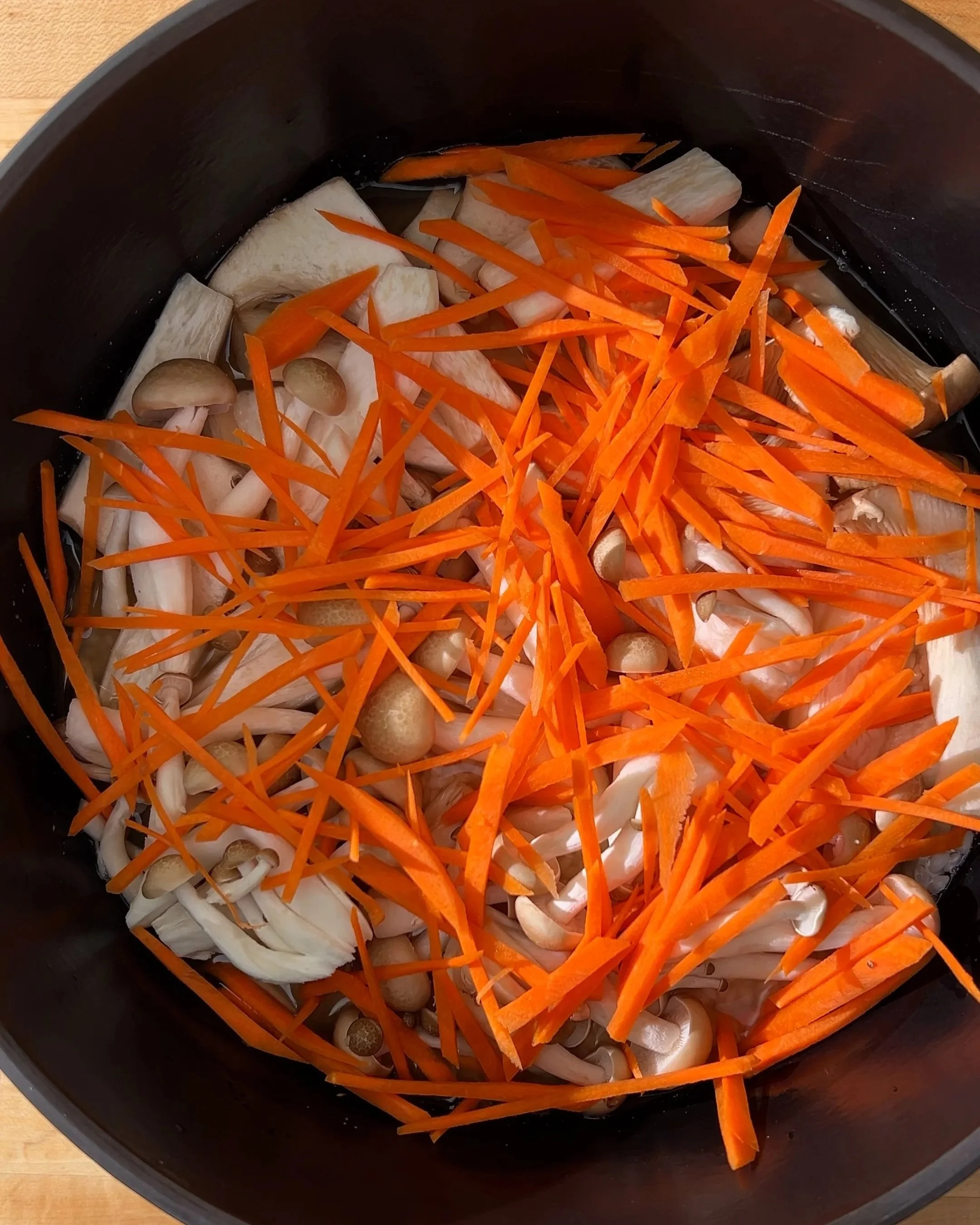 For this version, I used king oyster mushrooms and shimeji mushrooms. Each mushroom has its own unique texture; king oyster mushrooms are meaty and chewy, while shimeji mushrooms have a delicate, nutty flavor. But you can use any mushrooms you like. Shiitake and enoki are also great choices. I also added a few julienned carrots for color. Mushroom rice is absolutely delicious, but let’s be honest, it can look a little too brown, so the carrots add some nice contrast and brightness to the dish.