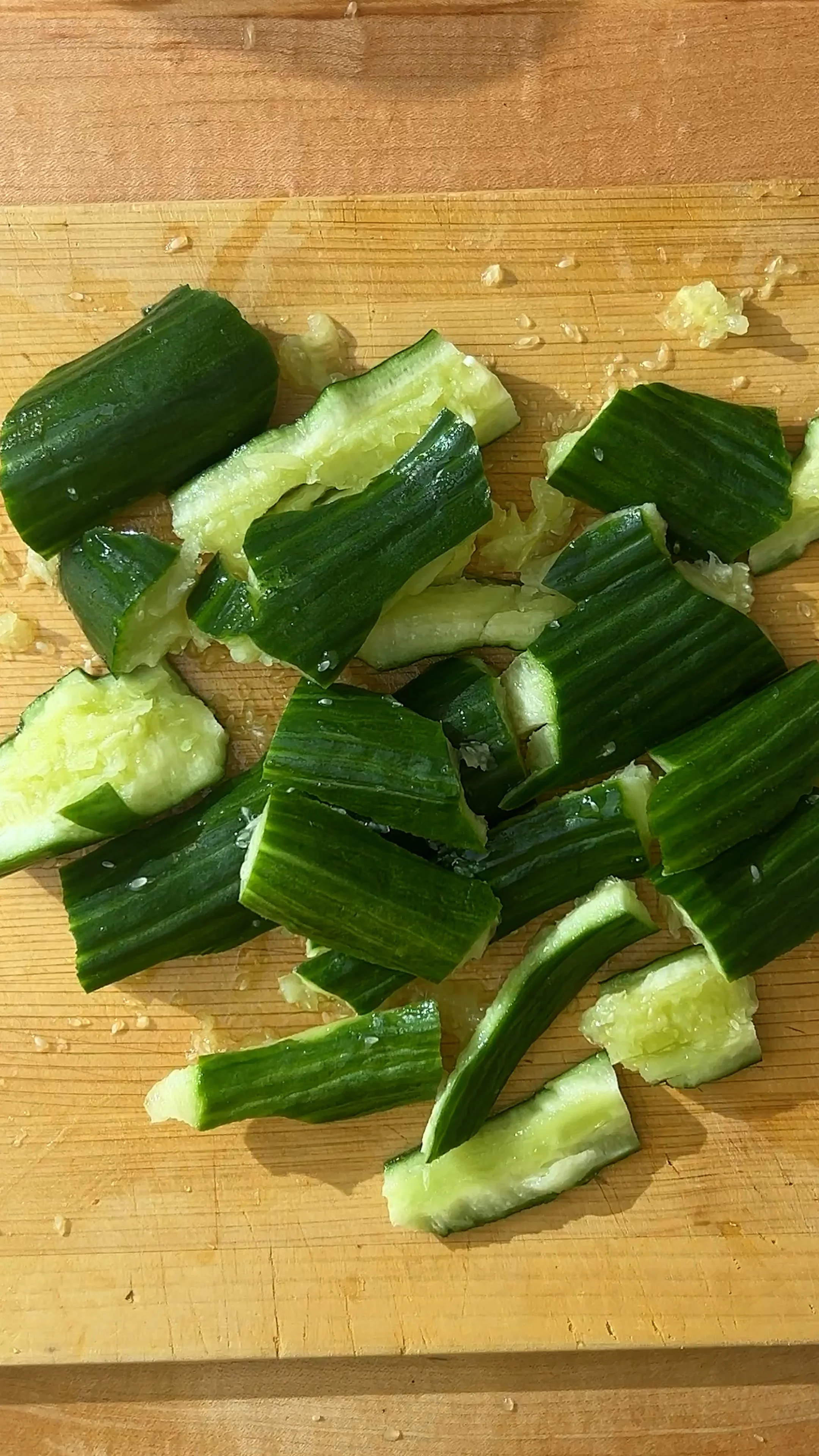 Smash the cucumbers. Covering them with kitchen towels helps prevent splattering. Place the smashed cucumbers in a medium-sized bowl. Sprinkle with salt and toss well. Leave them for at least 10 minutes to draw out moisture, then discard the liquid.