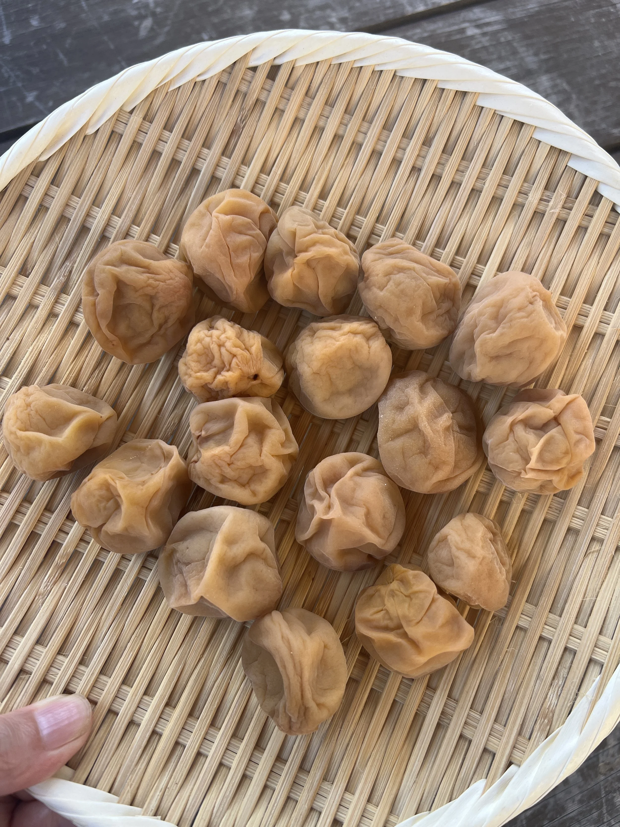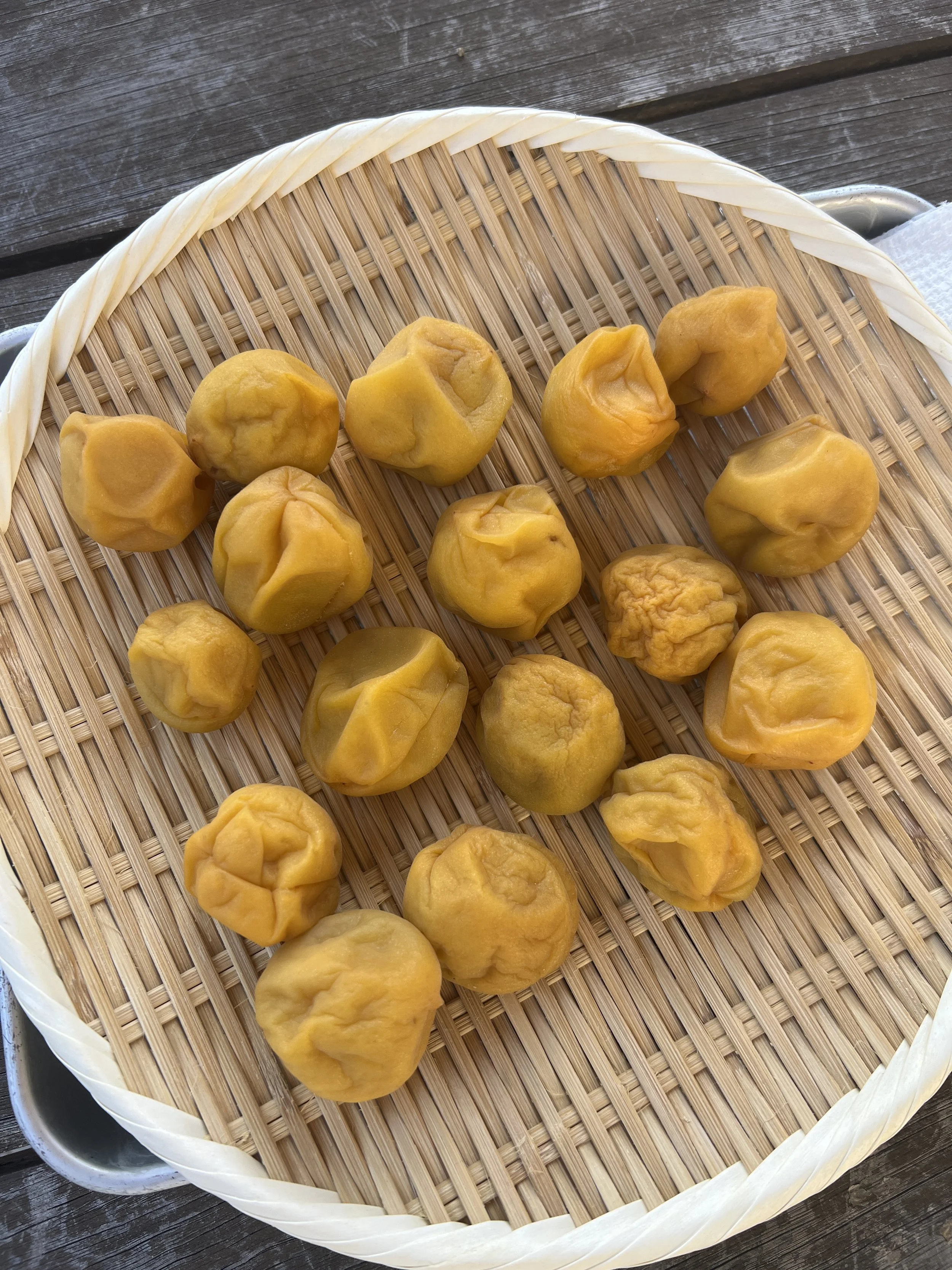 Umeboshi making takes time, patience, and most importantly, sunshine. First, you pickle the ume fruits with salt for a couple of months. Then comes the three-day sun-drying process, where you lay them out under the summer sun to develop that signature tang and chewy texture. In Japan, people usually pickle ume in June during the rainy season. After the rainy season ends, you need to check the weather forecast and find three consecutive clear days. You dry the ume outside for two days, then bring them indoors. On the third day, you leave them outside overnight to expose them to the night dew.