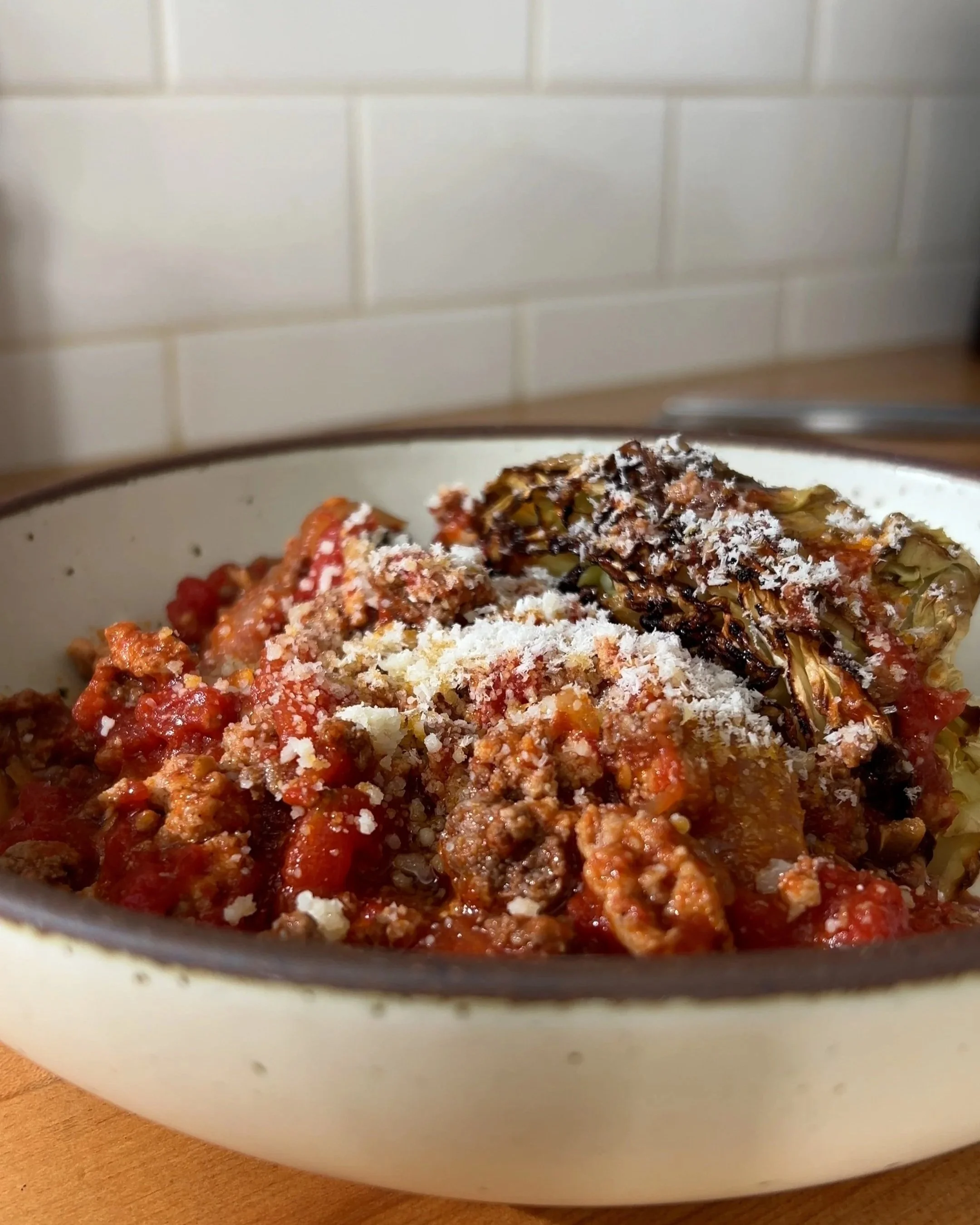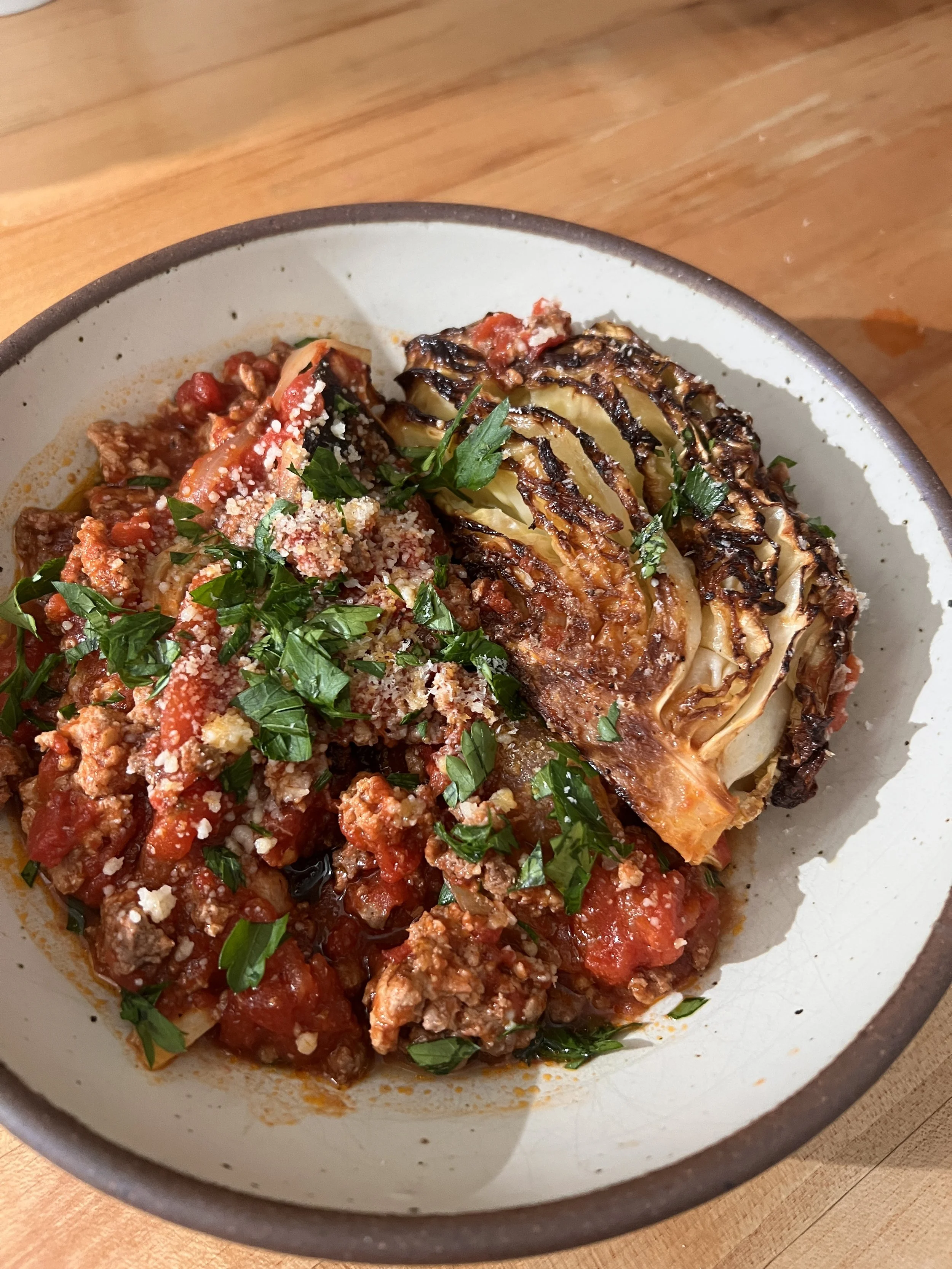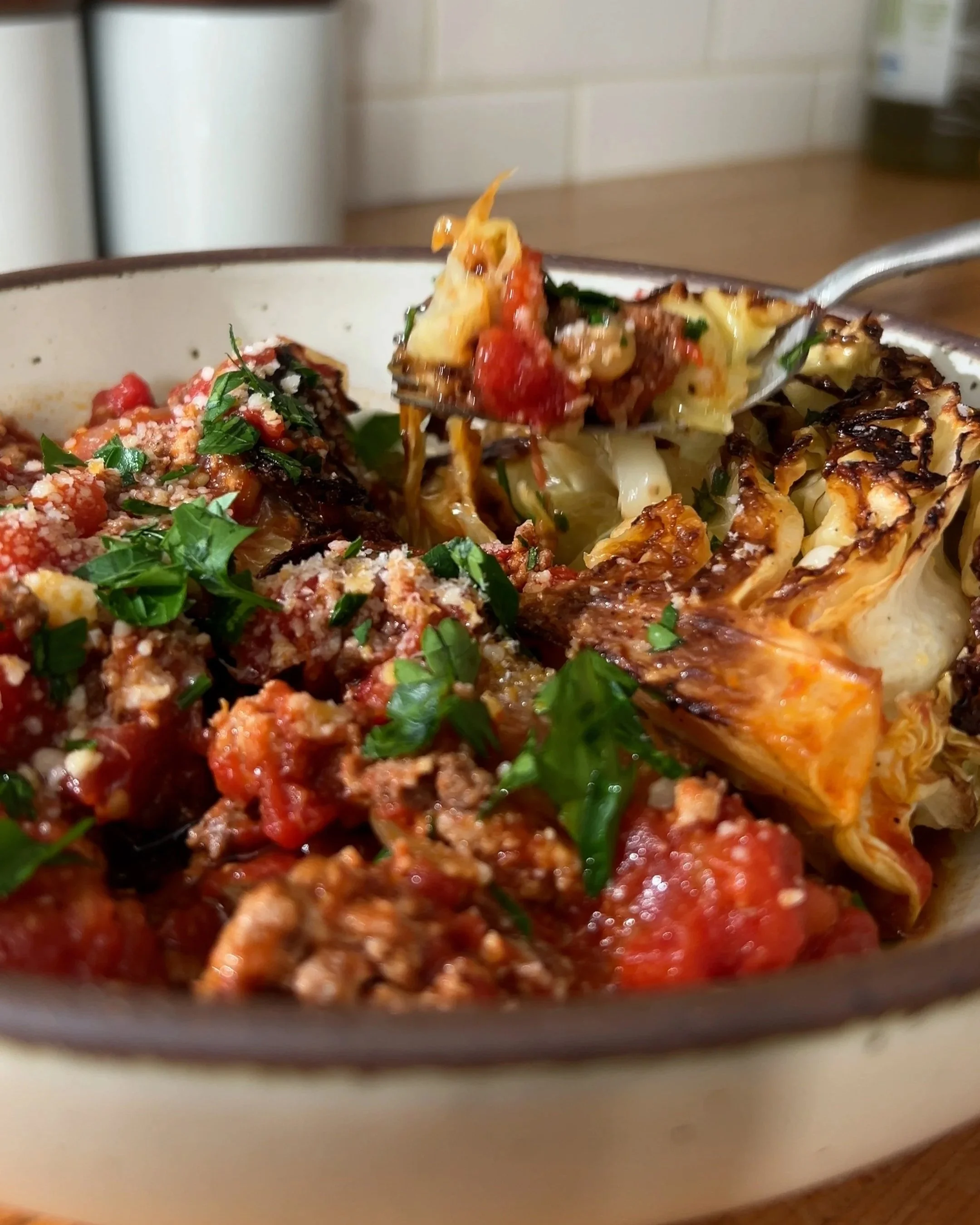 Arrange the roasted cabbage wedges in a shallow bowl or serving dish. Spoon the sauce over the top, then finish with grated Parmesan and chopped parsley, if using.