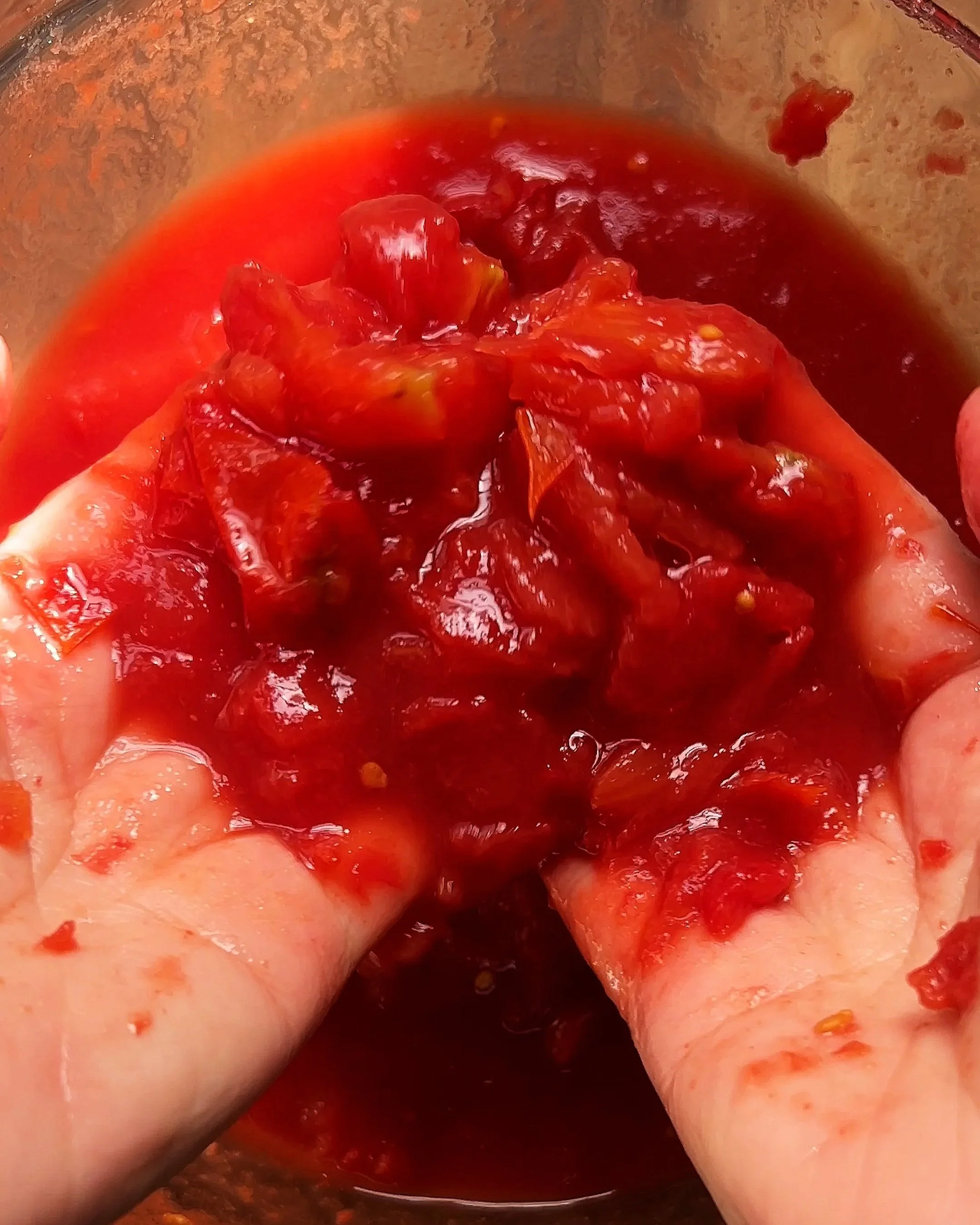 I use canned whole peeled San Marzano tomato. I mentioned this in my ratatouille post but when choosing canned tomatoes, avoid diced ones when you are stewing. They’re usually treated with calcium chloride to keep their shape, which means they won’t break down as nicely in a stew. Use whole peeled tomatoes instead. I love San Marzano tomatoes for this. They’re naturally sweet and mellow, with no harsh acidity. I usually dump all in a bowl and crush with hands. It gets messy so make sure you wear apron and don’t wear white shirt. You might ask “Do I have to crush the tomatoes by hand?” You can use a food processor if you want to keep your hands clean, but hand-crushing is the best way to get that perfect rustic texture.