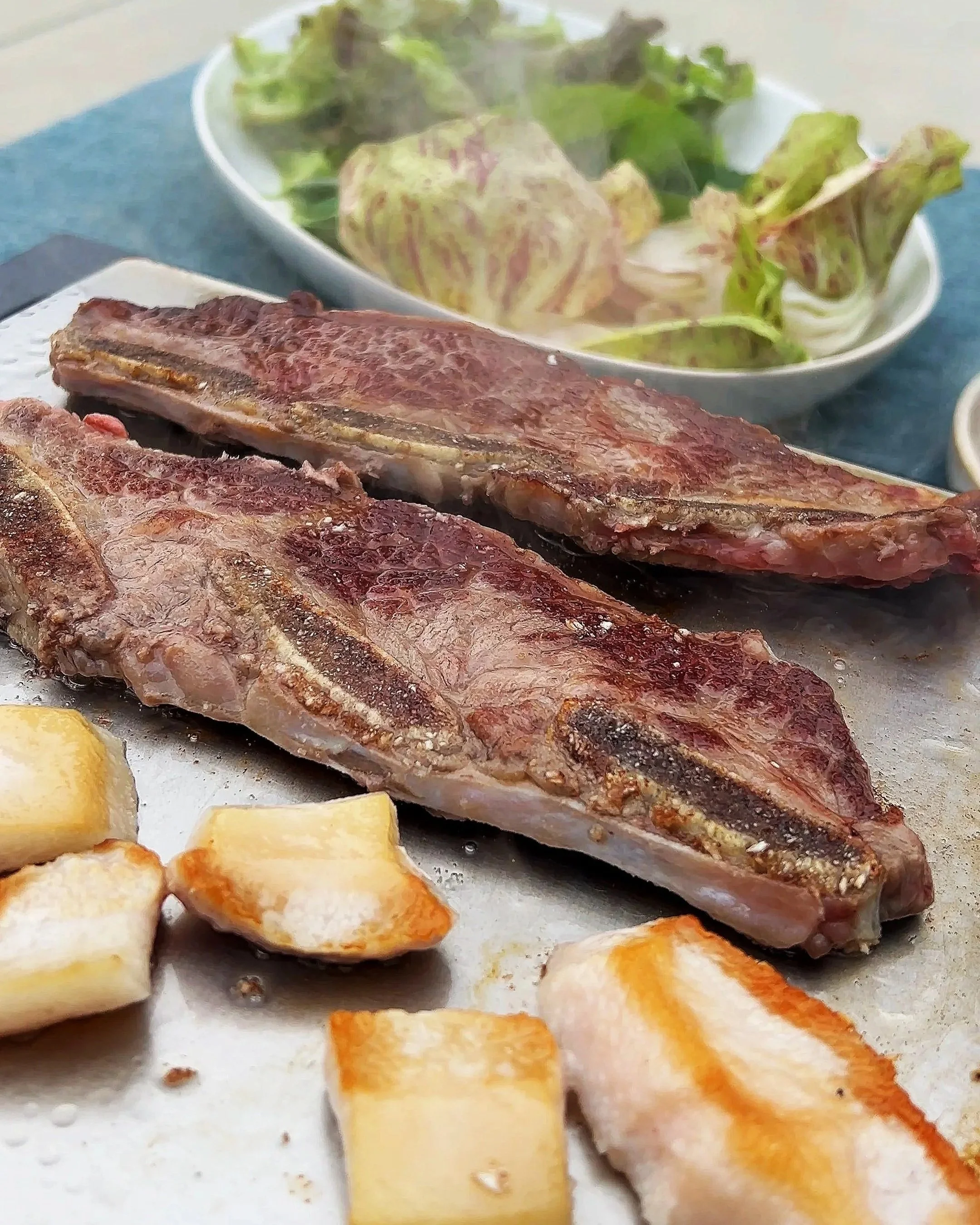 For this gathering, I went to a Korean grocery store and picked up leafy greens for barbecue, perilla leaves, beautifully marbled beef, and pork jowl, a rich and fatty cut from the pig’s cheek. I also set out a variety of condiments. I had some leftover kimchi base from Perilla LA, so instead of saamjang, I served that alongside yuzu kosho and neri togarashi. Neri togarashi is a spicy shichimi togarashi paste that was new to me and gifted by a friend. It was not overly spicy and paired especially well with the fatty cuts of meat.