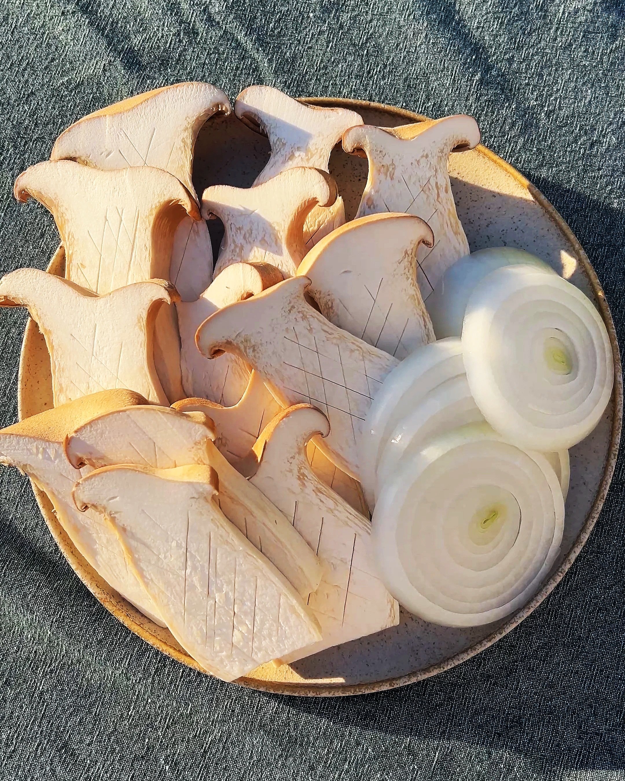 Trumpet mushroom, slice thinly and score